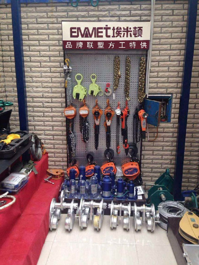 圖中上邊懸掛的是用戶最常用到的埃米頓手拉葫蘆、手扳葫蘆,下面擺放的是一排噸位不等的埃米頓千斤頂。